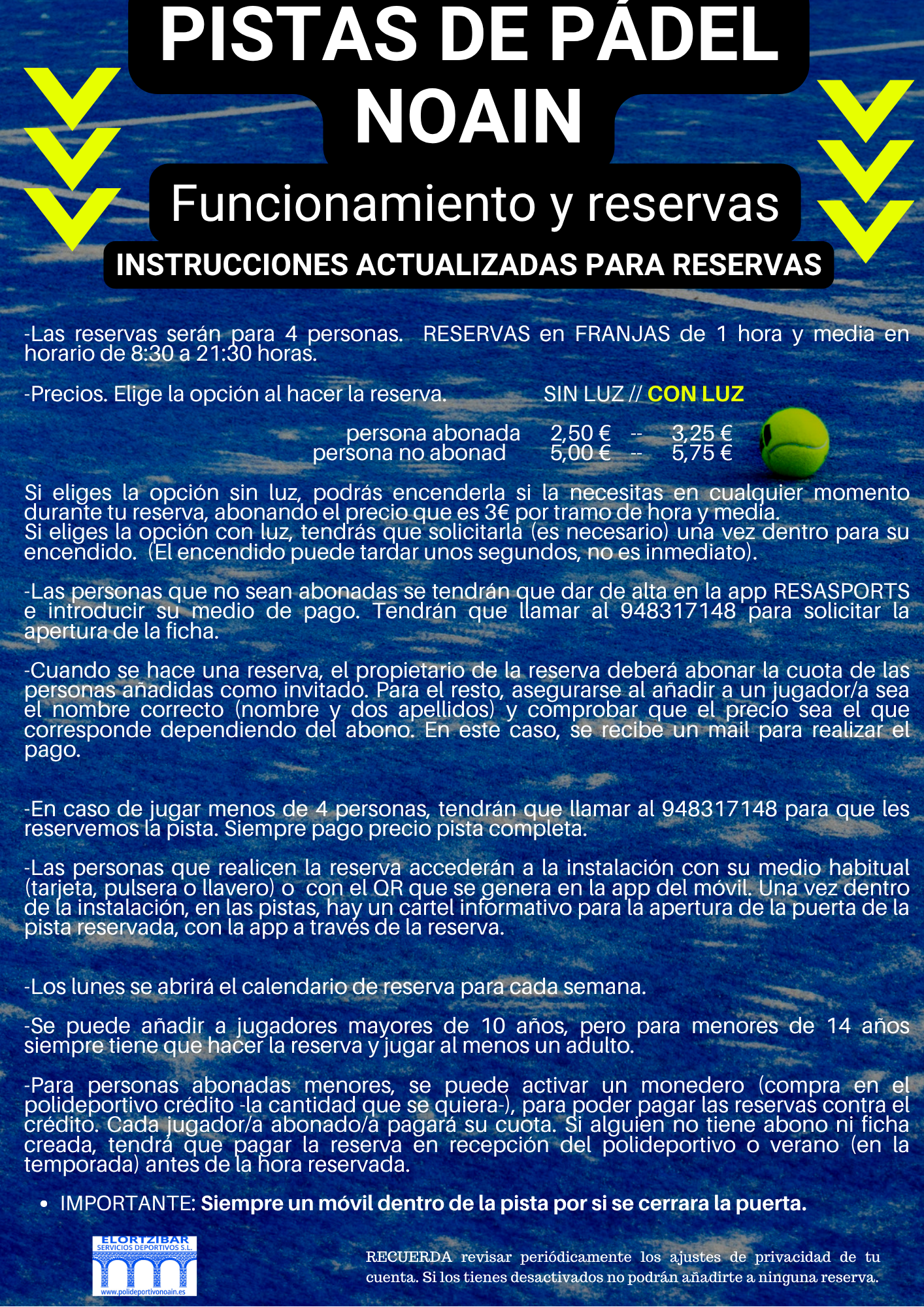 Si tienes algún problema en las pistas, llámamos al 948317148 en horario de 8:30 a 22:00 de lunes a viernes, de 9:00 a 21:30 sábados y domingos y festivos de 9:00 a 13:30.